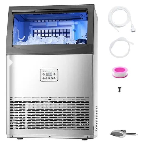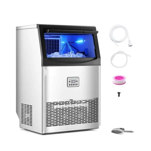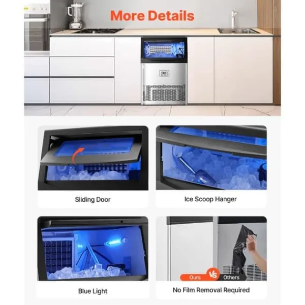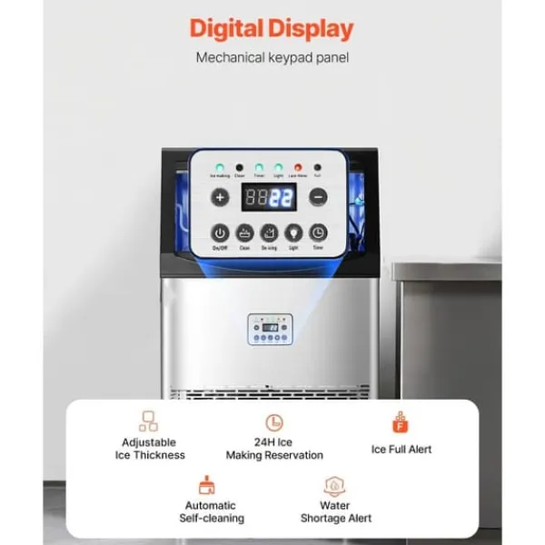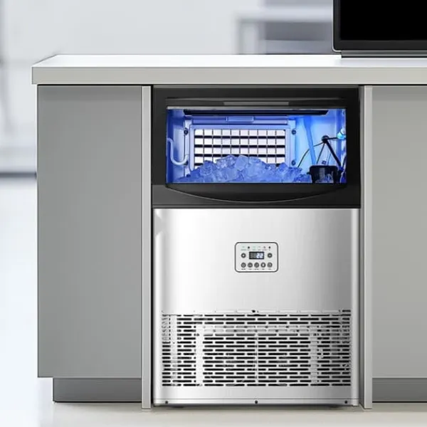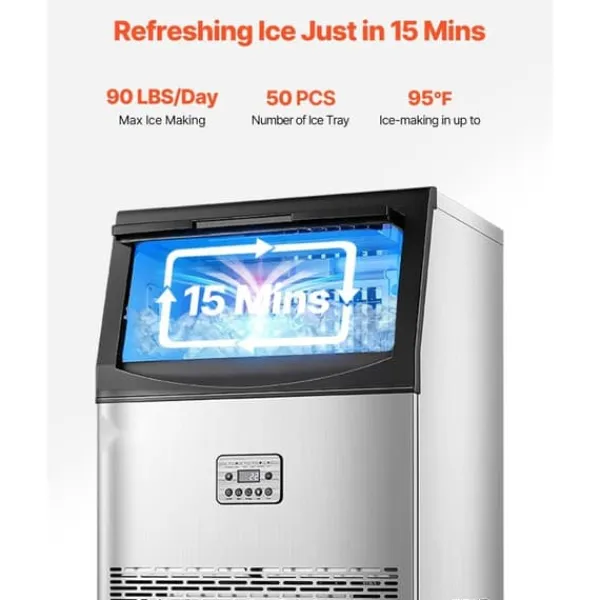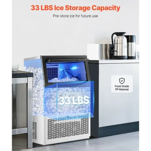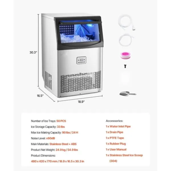 Den här kommerciella ismaskinen är utformad med 50 iskuber och kan producera upp till 90 lbs is per dag (testat vid omgivningstemperatur på 50-100,4℉/10-38℃). Den kompakta ismaskinen har en generös lagringskapacitet på 33 lbs och passar perfekt i ditt hem, kafé, bar, dryckesbutik eller restaurang.