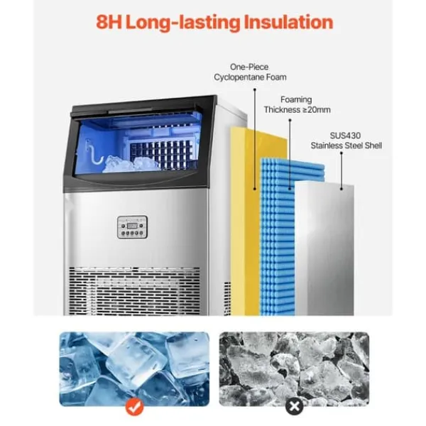 Isoleringen på minst 20 mm cyklopentanisoleringsmaterial och kvalitetsskalet effektivt isolerar extern värme, vilket håller isbitarna frysta i upp till 6-8 timmar. Den automatiska självrengöringsfunktionen säkerställer en hygienisk miljö för istillverkning.