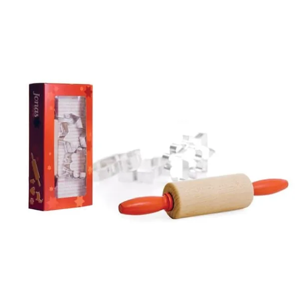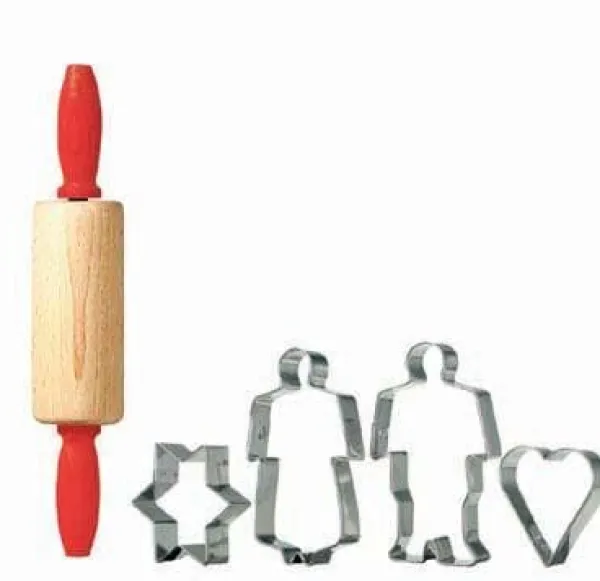 Fint förpackat bakset till barn, en kavel med röda handtag och 4 kakmått, en pepparkakas gubbe och gumma, en blomma och ett hjärta såklart.