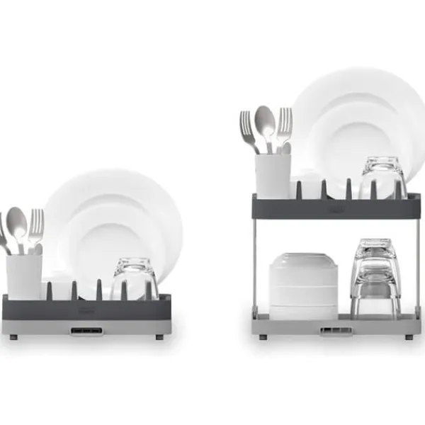 Optimera ditt torkutrymme med Joseph Joseph Duo diskställ. Denna modell med 2 nivåer är justerbar och dirigerar vattnet till en integrerad pip för effektiv avrinning. Den övre nivån är designad för tallrikar och skålar, medan den nedre nivån förhindrar ansamling av vatten. Inkluderat är en avtagbar bestickbehållare och halkfria fötter för stabil användning.