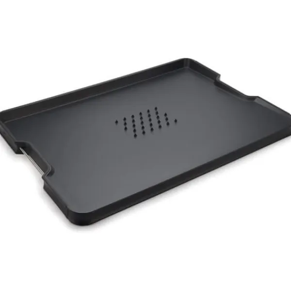 Upptäck skärbrädan Joseph Joseph CutCarve Plus, extra stor och multifunktionell. Med sin lutande bas, upphöjda kanter och hällkrokar gör den matlagningen enklare. Den är halkfri och har handtag i rostfritt stål, vilket gör den perfekt för att skära kött och grönsaker. Tål maskindisk.