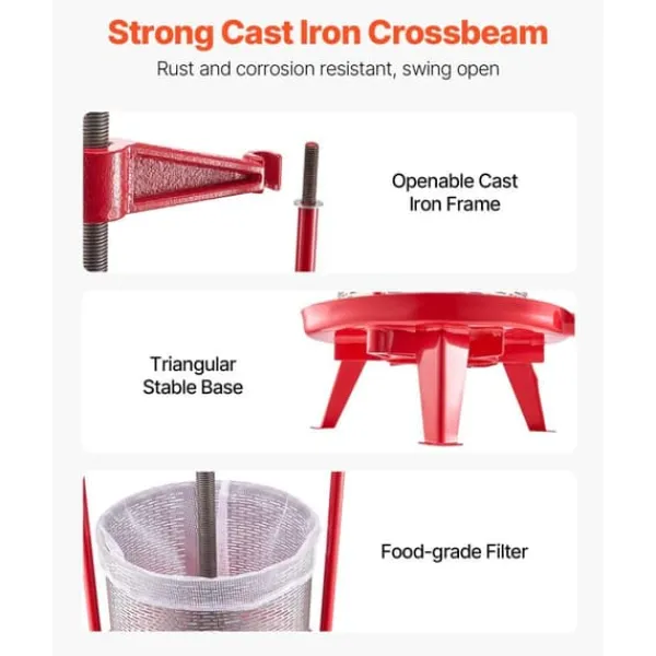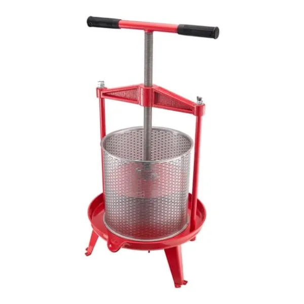 Fruktvinpressen är byggd med en solid tvärbalk i gjutjärn och kan svängas upp, vilket gör det bekvämt att ladda korgen eller placera frukter direkt inuti. Den triangulära basen säkerställer stabilitet och säker placering på marken. Levereras med två filterpåsar av livsmedelskvalitet, vilket säkerställer säker och hygienisk användning.