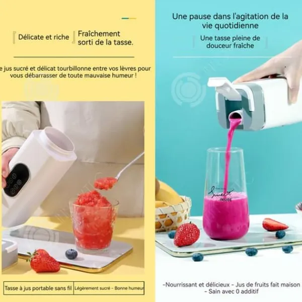 3. Praktisk laddningsdesign: Denna mixer är utrustad med en TYPE-C laddningsport, vilket ger hög kompatibilitet för att ansluta till olika enheter såsom power banks, datorer, etc. Den har ett inbyggt batteri med hög kapacitet, vilket ger utmärkt batteritid, så att man kan övervinna begränsningar av eluttag för att kunna göra juice när som helst och var som helst.
