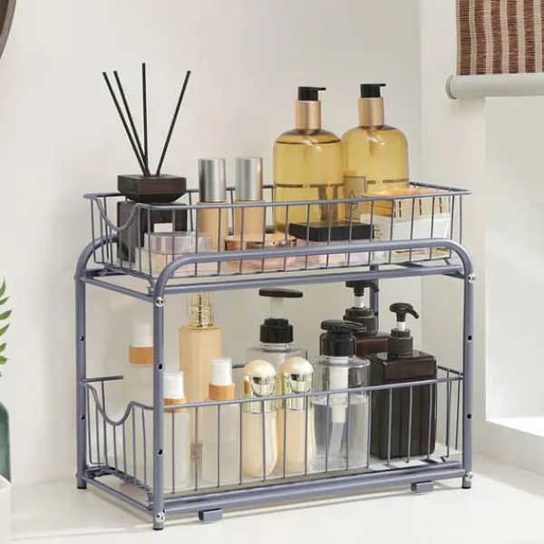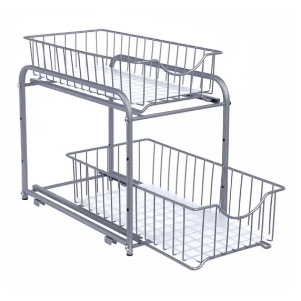 Med denna justerbara hylla med utdragbara lådor får du en smart och mångsidig förvaringslösning för hemmet. De två metallramade lådorna glider lätt ut, vilket gör det enkelt att nå allt innehåll – oavsett om det handlar om rengöringsprodukter under diskbänken eller toalettartiklar i badrummet.