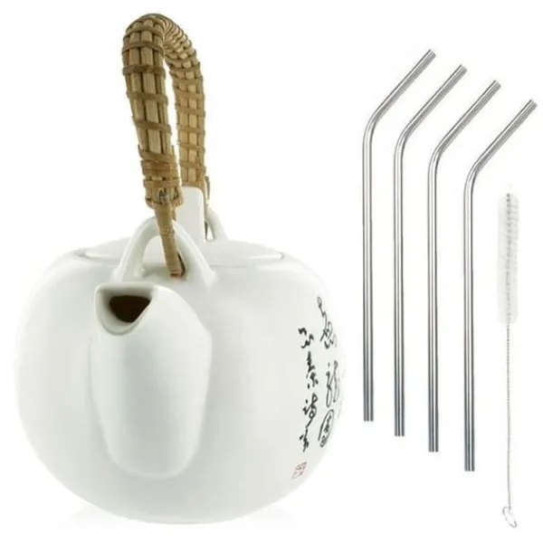 Elegant vit teapot på en liter, handgjord i provinsen Jingxi i Kina! Tillverkad av vit lerjord och utrustad med ett vackert avtagbart handtag i rotting (praktiskt för rengöring), den är prydd med en berömd dikt skriven i kinesiska teckensnitt: Ett oöverträffat te plockat på berget Meng, Vattnet från den klara källan i Yangtze-floden, Ett Que She*-te som har dragits i en klar källa, Ett Long Tuan**-te förberett med friskt vatten. Emaljerad insida, levereras med sitt filter i rostfritt stål. Idealisk för te och örtteer. De 4 sugrör av rostfritt stål på 21 cm är lätta att rengöra med en rengöringsborste med liten borste. De hjälper till att bevara naturen och förhindrar att man slänger pappers- eller plasttillbehör.