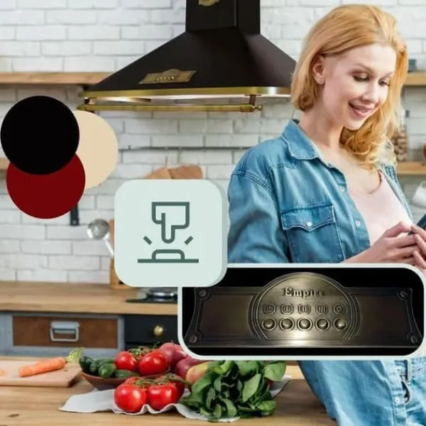Kaiser Empire A 9315 Em ECO, Väggmonterad fläkt Empire 60 cm Svart, Finish: svart med bronsefärgade metallinslag (logotyp, kontrollpanel, handtag), Lyxproducent i Berlin, German Brand Award 2017/2018, German Design Award 2020, Produktion enligt höga kvalitets-, design- och miljöstandarder, Fläkten är utrustad med tysta och kraftfulla motorer, Energibesparande LED-belysning, Eleganta detaljer i massivt metall, knappar, handtag i antik stil, För ventilering eller återvinning, Aktivt kolfilter ingår, Energiklass: A, Ventilationseffektivitet: A, Belysning: A, Kontrollerad med tryckknappar på 3 hastigheter, Metalliska filter som kan diskas i diskmaskin ingår, Ljudnivå: 51 dB (hastighet 1), 69 dB (hastighet 3), Luftutlopp: Ø150 / Ø120 mm, Flexibel alu-slang Ø150 mm lätt att installera, adapter Ø120 mm ingår, Utsugningsläge: rök och dofter filtreras och avlägsnas, Återvinningsläge: fläkten används som luftrenare, Fettfilter i rostfritt stål och aluminium, rengöring rekommenderas varannan månad, Aktivt kolfilter med hög absorptionskapacitet, Märke: Kaiser, Modell: A 6315 Em ECO, Årlig förbrukning: 52,4 kWh, Dynamisk fluid effektivitet: 29,0 (klass A), Belysning: 30,1 lux/W (klass A), Fettfiltrering: 70,2 % (klass D), Minsta flöde: 196 m³/h, max: 588,7 m³/h, Max motorflöde: 910 m³/h, Min ljud: 51 dB, max: 69 dB, EEI: 54,8, Tryck: 414 Pa, Absorberad effekt: 142 W, Belysning: 2 × 2 W, Ljusstyrka över matlagningsytan: 120 Lux, Leverans med transportör till trottoaren, Vänligen ange ett giltigt telefonnummer och leveransadress.