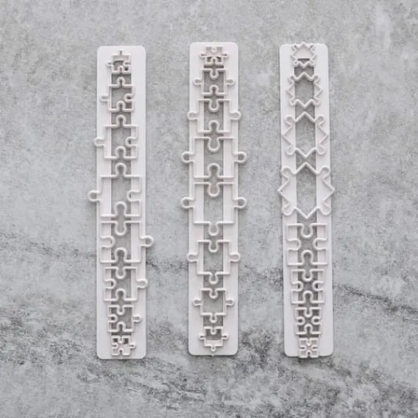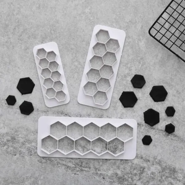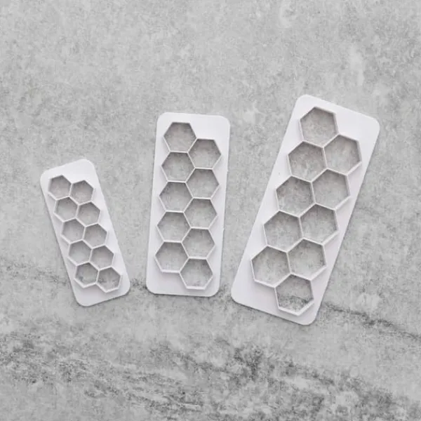 Ett paket med tre stycken hexagon och 3 st pusselutstickare från BakeCake som man kan sticka ut snygga kanter till cupcakes, kakor eller tårtor. Kan användas på sockerpasta, kakdeg, gumpaste, marsipan osv. Enkelt att använda och rengöra.
