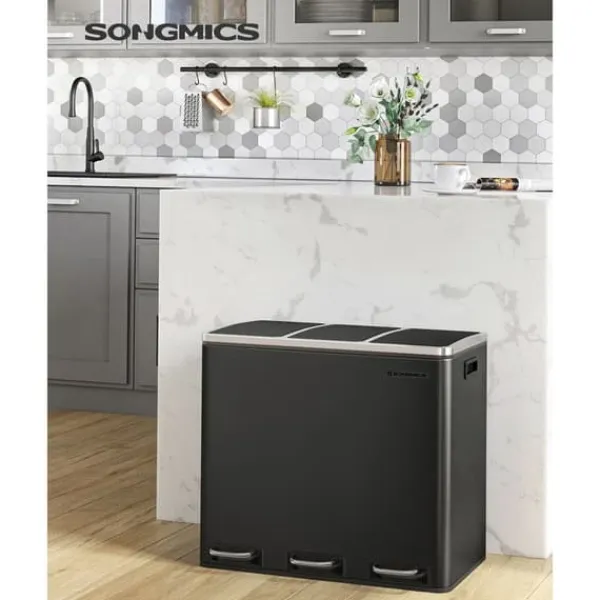 Återvinning kan också vara enkelt: Den här pedalförsedda soptunnan med 3 separata fack gör det till en barnlek att sortera dina sopor, t.ex. restavfall och organiskt avfall. Allt du behöver göra är att trycka på pedalen och slänga avfallet i det inre facket. Du behöver inte ens röra vid soptunnan med handen, vilket säkerställer hygienen. En ”valp- och barnsäker” soptunna: Brukar din hund rota i papperskorgen? Sträcker sig dina barn ofta in i den öppna soptunnan? Om så är fallet vill du sätta stopp för det. Det är här vår pedalbehållare kommer in i bilden! Locket öppnas bara när du trampar på pedalen.Produktdetaljer:Färg: SvartMaterial: Stål, PP-plast (innerbehållare), ABS-plast (lock)Total storlek: 61,5 x 31,5 x 56 cm (L x B x H)Storlek på varje innerbehållare: 18 x 26,5 x 49 cm (L x B x H)Total höjd (med locket öppet): 84,5 cmVikt: 9,1 kgLeveransens omfattning:1 x papperskorg1 x instruktioner (DE, EN, FR, ES, IT)SONGMICS Anmärkningar:Rengör produkten genom att torka av den med en fuktig trasa och sedan torka den.