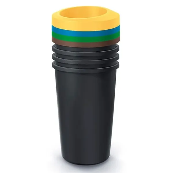 Set med 4 Keden återvinningskärl.4 runda papperskorgar för att dela upp skräpet och kunna återvinna på ett ordnat sätt.De har en slät finish och ett praktiskt öppet lock.I olika färger.Mått: 39,4 x 29,8 x 79 cm styck.Kapacitet: 45 liter styck.