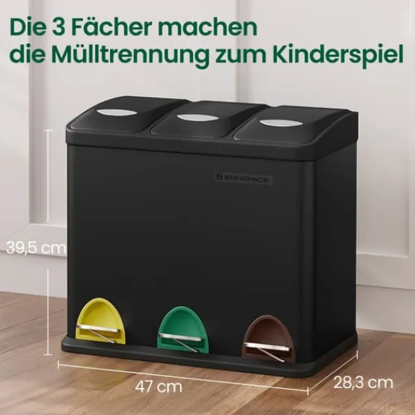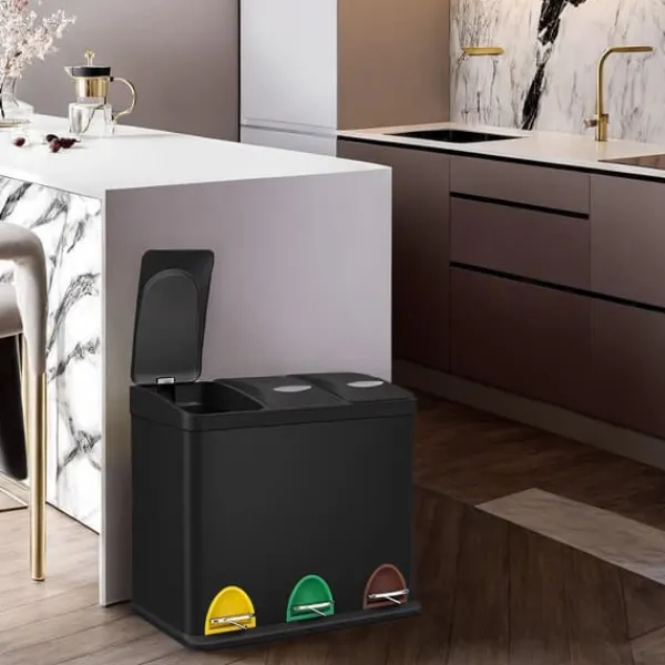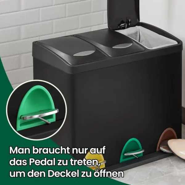 Denna kökssopbehållare har en praktisk design med tre fack för effektiv avfallssortering, vilket gör den idealisk för inomhusbruk. Utrustad med fotpedal och lock möjliggör den hygienisk och handsfree användning, samtidigt som dess kompakta storlek passar bra i begränsade utrymmen.