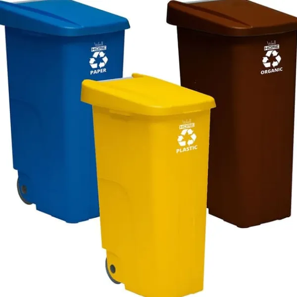 Återvinningspaket med.Uppsättning av.WellHome Reciclo kärl, 110 liter vardera, med.Helt öppet lock och för.Vanliga typer av avfall: organiskt, kartong och plast.Idealiska behållare för proffs och samhällen som främjar avfallsåtervinning.Nestbar och på hjul.Locken öppnas helt.Största hjuldiameter:ø145 mm.Mått (mm):420.570.880 styck.Kapacitet: 110L styck.Totalt i behållare, 110 liter styck, i färgerna blå/brun/och gul.