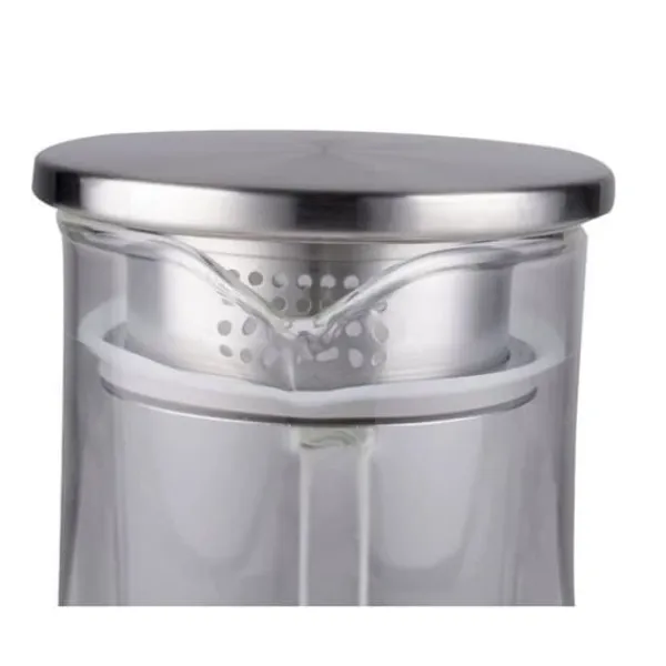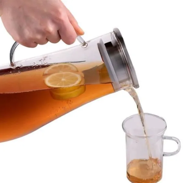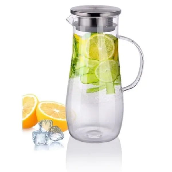 Denna karaff i glas med grepp i borosilikatglas, med en kapacitet på 1,4 liter, är perfekt för sommarlagning av kalla drycker men även för te. Produktspecifikationer: – Ergonomiskt handtag – Material: glas, rostfritt stål – Mått: 10,5×24 cm – Kapacitet: 1,4 l – Vikt: 445 gSpecifikationer: