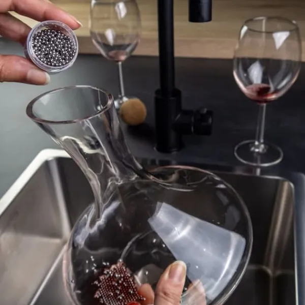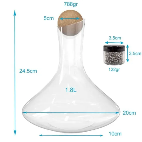 Med en kapacitet på 1800 ml har vinkaraffen den perfekta dekanteringskapaciteten för ditt 750 ml vin. Karaffen levereras med rengöringspärlor i rostfritt stål för att göra rengöringen av ditt glaskärl så enkel som möjligt.
