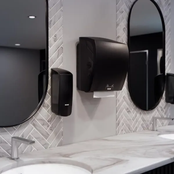 Handtork KATRIN System Plus M2, hygiensk lösning där plana ark matas ut i lagom storlek för kontrollerad förbrukning
