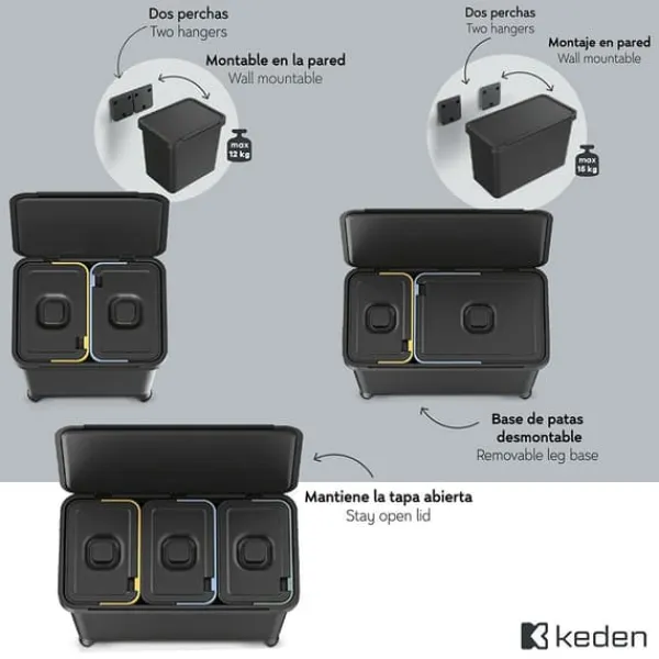 KEDEN återvinningssorteringssystem.Mycket praktiskt, eftersom det upptar det nödvändiga utrymmet i ditt hus.Det finns i 3 storlekar.Det kommer att uppfylla användarens krav.Dessa sorteringssystem har utrustats med 2 eller 3 praktiska insatser.Varje insats har fasta 100% ABS-handtag.Det har en avtagbar benbas och en vägghängare.Färg: Svart.Kapacitet: 1 insats på 10L + 1 insats på 23L.Mått: 57 x 29,5 x 41 cm.