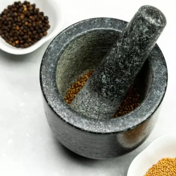 En rejäl köksbruk med en diameter på 12 cm. Klassisk form, massiv, gjord av hård sten. Ett oumbärligt tillbehör för att mala kryddor, örter, socker till strösocker, förbereda såser och pastor, eller färska kryddblandningar. Handgjord av ett stycke extremt hård naturgranit. Vackert utseende som ett konstverk kommer att vara en synlig dekoration i ditt kök. Perfekt finish genom att slipa murbrukets utsida och tamper. Specifikation: – Sabotagestorlek: 15,5 cm – Murbruksstorlek: Ø12 x12 cm – Material: Naturgranit