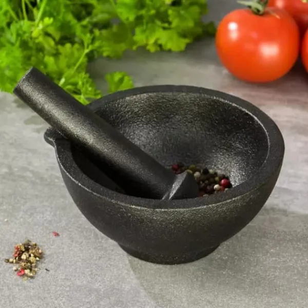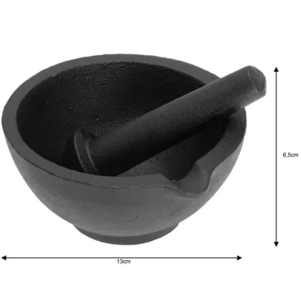 Mortel och mortelstöt ingår Egenskaper: – Bekväm att använda och rengöra – Något grov yta som underlättar friktion – Profilerad tratt – Tillverkad av gjutjärn – Mått Diameter: 13 cm Höjd: 6,3 cm Stötstötslängd: 12,5 cm.