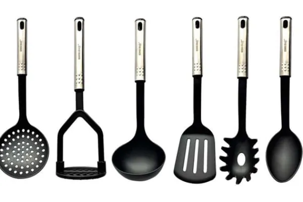 En uppsättning köksredskap av stål och termoplastisk nylon. Redskap avsedda för köksredskap med teflon och keramiska beläggningar som är känsliga för repor. Setet innehåller ett stativ som gör att du kan förvara dem i ordning och alltid ha dina tillbehör inom räckhåll. – Endast ekologiska och säkra material användes. – Nylondel som tål temperaturer upp till 200°C – Repfria produkter avsedda för alla typer av köksredskap. Setet innehåller: 1 x hålslev 1 x klassisk sked 1 x pastasked 1 x hålslev 1 x slev 1 x potatisstöt Redskapslängd ca 30 cm