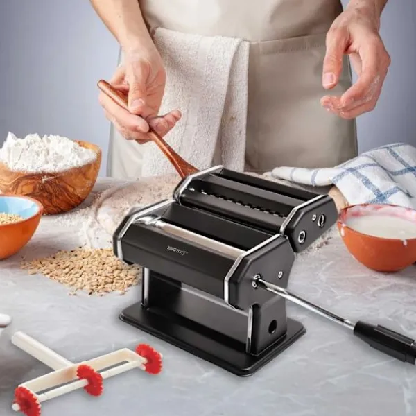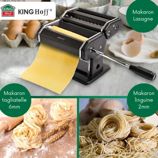 KINGHOFF KH-1927 är designad för att ge dig en högkvalitativ upplevelse. Den robusta stålstrukturen garanterar lång hållbarhet och ett stilrent utseende. Med handdrift och vev kan du enkelt styra processen utan behov av elektricitet, vilket ger dig friheten att skapa när som helst. Justera tjockleken på degen för att passa olika pastatyper, och med de utbytbara knivarna kan du enkelt skära tagliatelle (6 mm) och linguine (2 mm) med precision.