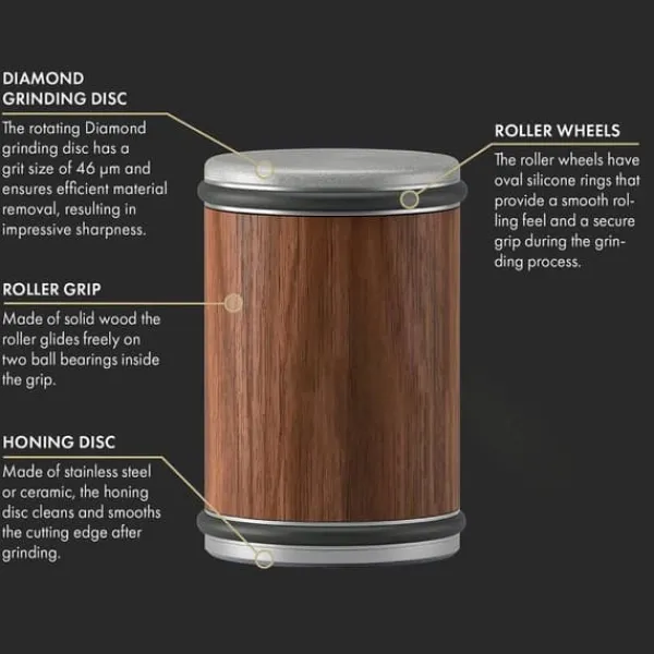 Dra bara kniven över valsen eller använd diamantslipstenen för finjustering, så återställs bladets skärpa snabbt. Den rullande designen säkerställer jämn slipning och exakt återställning av knivens skärförmåga, vilket förbättrar matlagningshastigheten och effektiviteten.
