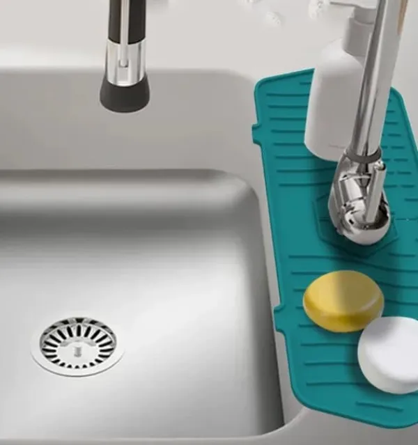 3、 Tömningsfunktion: Vattenfläckarna som stänkte eller läckte från kranen strömmar direkt till diskhon genom silikonkuddens dräneringsport, vilket håller köksbänken ren och hygienisk hela tiden.