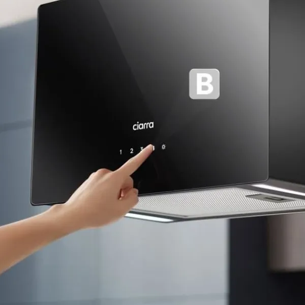CIARRA CD4850B är en elegant köksöfläkt som kombinerar modern design med hög energieffektivitet. Den hängs upp ovanför spisen och smälter in perfekt i alla typer av moderna kök. Med sin borstlösa likströmsmotor på 85 W erbjuder den en kraftfull luftflödeskapacitet upp till 700 m³/h och är samtidigt energisnål med en årlig förbrukning på endast 12 kWh. Tack vare Wi-Fi-anslutning och en intuitiv touchpanel kan fläkten styras smidigt via Smart Life-appen. Utrustad med aktiva kolfilter (ingår), säkerställer den effektiv luftrening och eliminerar matos. Det dubbla LED-ljuset, i ekonomiskt eller intensivt läge, belyser effektivt matlagningsytan.