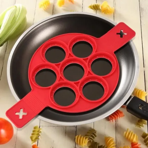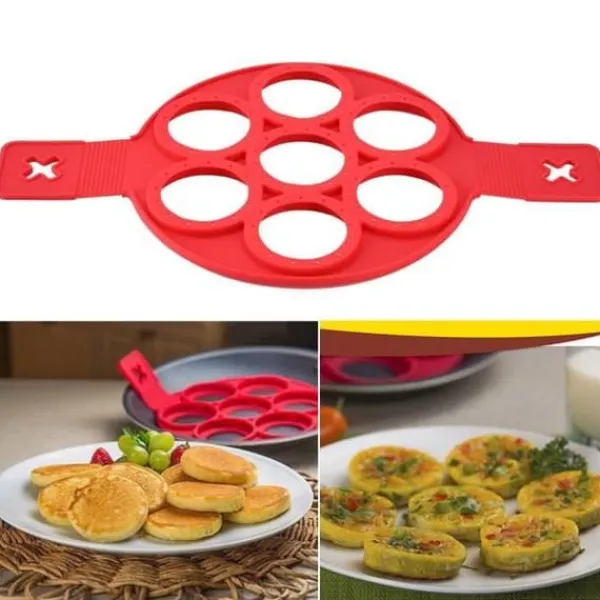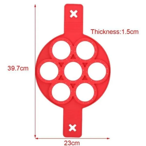 Förbered dina pannkakor och omeletter enkelt med denna röda silikonform. Utrustad med 7 cirklar, låter den dig laga flera ägg eller pannkakor samtidigt. Tillverkad av högkvalitativt silikon, det är giftfritt, värmebeständigt och lätt att rengöra. Perfekt för en snabb och god frukost.