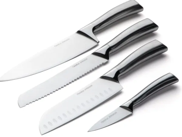 Ett mycket användbart och exklusivt knivset om fyra knivar, japansk kockkniv, kockkniv, brödkniv och en skalkniv. Knivarna har mycket bra skärpa och fungerar givetvis utmärkt att använda även till grönsaker, kött, fisk och annat.