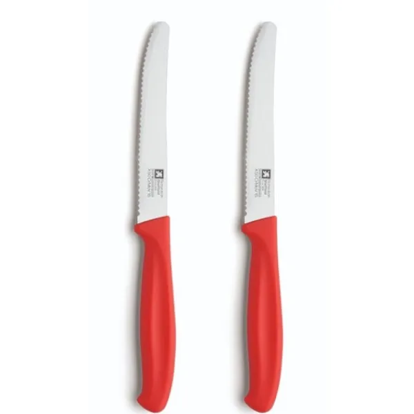 Richardson Sheffield 2-delat tomatknivsset. Bladen på dessa hushållsknivar är tillverkade av högkvalitativt rostfritt stål, vilket garanterar långvarig skärpa och utmärkt skärkomfort. Knivarna är idealiska för att skära tomater och liknande mjuka grönsaker. Finns i moderna, ljusa färger.