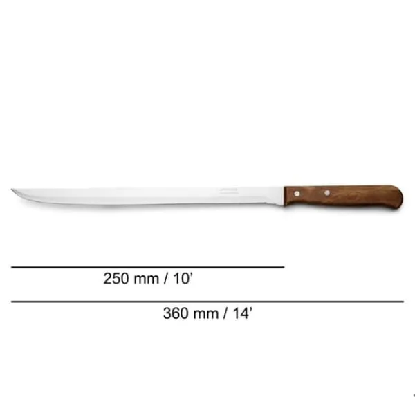 Arcos Latina 101300 skinkniv i Nitrum rostfritt stål med ett blad på 25 cm. Handtag i komprimerat trä, hållbart och vattentåligt. Idealisk för precis skärning, levereras i en låda. Perfekt för charkuterientusiaster.
