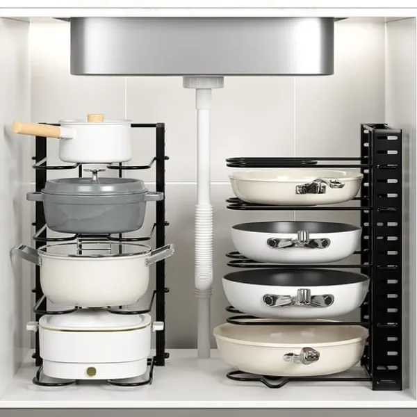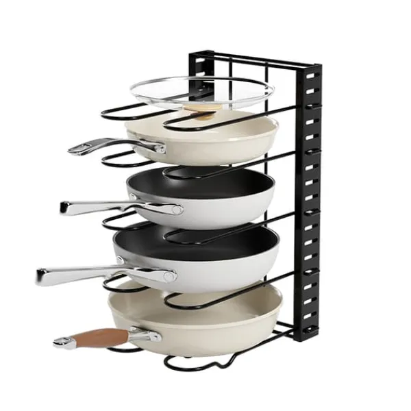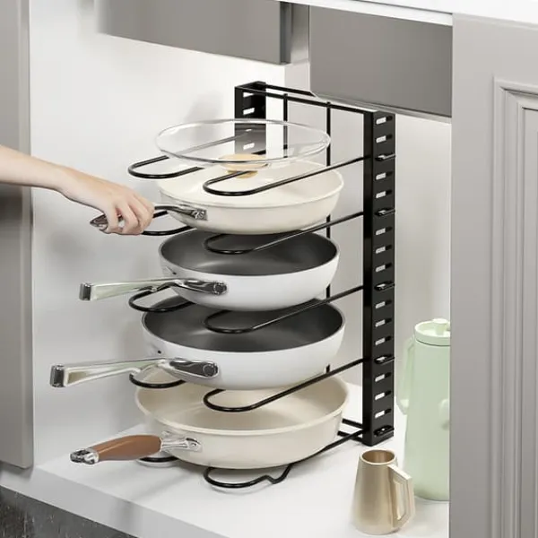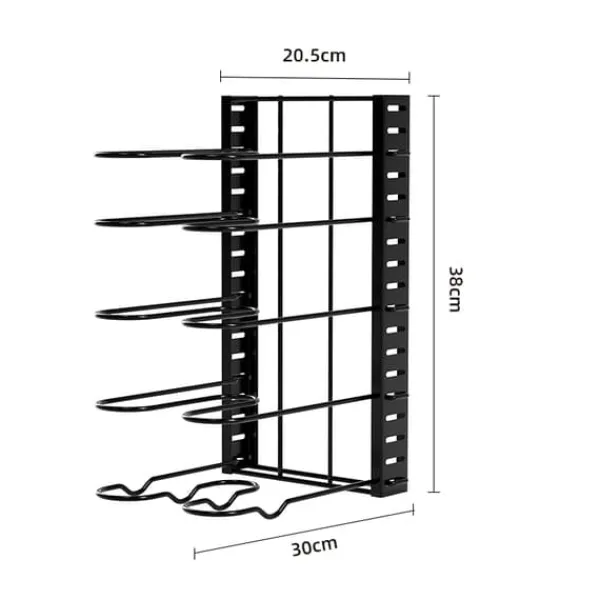 Justerbara nivåer: Har 5 justerbara nivåer för att rymma köksredskap av olika storlekar, från små stekpannor till större grytor och lock.