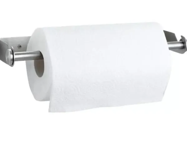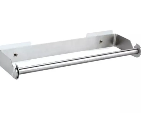 METALLHÅLLARE FÖR PAPPERSHANDDUKAR Elegant hållare för en handduk eller folie, som kan limmas på ytan eller monteras med skruvar. Egenskaper: – Tillverkad av rostfritt stål av hög kvalitet – Satsen innehåller endast skruvar för väggmontering (utan klistermärken) – Storlek: 33×3,5×10,8cm.