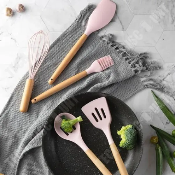 Upptäck TD® silikonsetet med köksredskap, som består av 9 till 11 delar. Perfekt för att laga mat med stil, detta färgglada set i rosa är både praktiskt och hållbart. Utmärkt för alla dina matlagningsbehov, det levereras med en förvaringslåda för enkel förvaring.