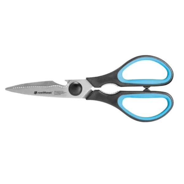 ENERGO™ Multifunktionssax Produktkod: 42-071 – sax med mångsidig användning – kan användas som flasköppnare eller nötknäppare – härdat blad, tillverkat av rostfritt stål – tandat blad underlättar klippning och ger bättre kontroll – ergonomisk form på handtagen garanterar komfort och bekvämlighet under användning – ett bladskydd ingår i saxen för att skydda bladen – total längd 220 mm
