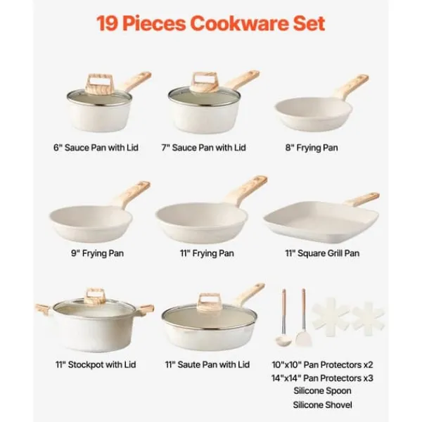 Set med 19 delar: Ett mångsidigt set med kastruller och kastruller som innehåller: 6 tums kastrull med lock, 7 tums kastrull med lock, 8 tums stekpanna, 9 i långpanna, 11 tums långpanna, 11 tums stekpanna med lock, 11 tums kastrull med lock, 11 tums fyrkantig grillpanna, 11 tums fyrkantig grillpanna, 1 10x panna skydd, silikonsked, silikonskyffel.