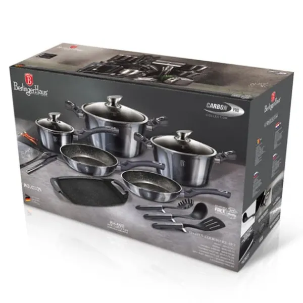 Kökskärlet i serien CARBON PRO från BERLINGER HAUS är tillverkat av högkvalitativt gjutet aluminium täckt med en trippel granitbeläggning (marmor) med en mycket hög hårdhetskoefficient. Ytterbeläggning i metallisk grafitfärg. Dessa snygga och fashionabla rätter är som standard utrustade med SOFT TOUCH-handtag (silikonhandtag). Lämplig för alla typer av spisar: gas, el, keramik, halogen, induktion. TURBO INDUCTION-systemet (de värms upp väldigt snabbt) gör att du kan spara upp till 35 % energi. Setet innehåller: Gryta Ø20 x 10,4cm 2,5L Gryta Ø24 x 11,8cm 4,1L Kastrull Ø16 x 7,5cm 1,2L Stekpanna Ø20 x 4,5cm 1L Stekpanna Ø24 x 4,8cm 1,7L Grillplåt 32 x 36cm (kan användas på 36cm) spisen och i ugnen) Köksredskap gjorda av termoplastisk nylon: – spagettisked – spatel – sked Egenskaper: Trippel granitbeläggning för att förhindra att mat fastnar Material: högkvalitativt gjutet aluminium Soft-Touch Handtag: silikonhandtag Glasskydd med luftventil medföljer TURBO INDUCTION system (värms upp mycket snabbt) 35 % energibesparing Tål diskmaskin För alla typer av spisar: gas, el, keramik, halogen, induktion Färg: metallisk grafit Granitbeläggningen är en teflonbeläggning berikad med granitpulver, tack vare vilken den får större hårdhet. Det är hårdare än teflon, men behåller sina fördelar: det brinner inte och fördelar värmen bra. Den kombinerar fördelarna med kokkärl i gjutjärn och teflon. Den har alla fördelar med teflon, men är mer motståndskraftig mot skador, till och med överlägsen keramiska beläggningar. Granitbeläggningen gör disken exceptionellt reptålig och hållbar. Denna typ av grytor och stekpannor låter dig också steka med en minimal mängd fett, eftersom kärlet värms upp på samma sätt som en sten och avger värme över hela ytan. Sammansättningen av aluminiumkroppen och den ferromagnetiska botten tillåter användning på induktionsspisar och alla andra typer av spisar och de bästa ac-termiska egenskaperna hos gjutet och smidd aluminium på alla spisar och värmeplattor.