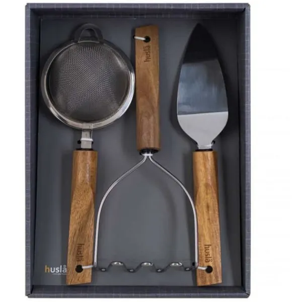 3-delat set med köksredskap Vi har komponerat vårt set så att de mest användbara köksredskapen alltid finns till hands. Dessutom, unikt akaciaträ i kombination med glänsande rostfritt stål gör att setet inte bara ser unikt ut, utan också en bra följeslagare i vardagsmatlagning. Tekniska data för produkten på grund av det naturliga träet som utgör handtaget, rekommenderas inte att diska i diskmaskin. Satsen innehåller: 1x degspad, 1x potatisstöt, 1x sil Satsen är förpackad i en ekologisk kartong. .