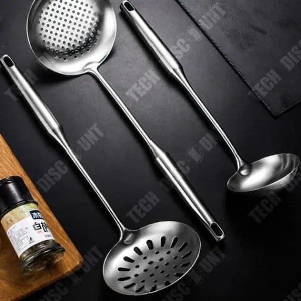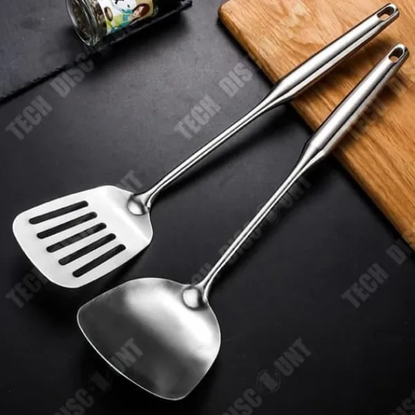 Upptäck detta set med 7 köksredskap i rostfritt stål, lätt och hållbart. Med en non-stick beläggning är dessa redskap utformade för ett bekvämt grepp och långvarig användning. Idealiskt för alla dina kulinariska behov.