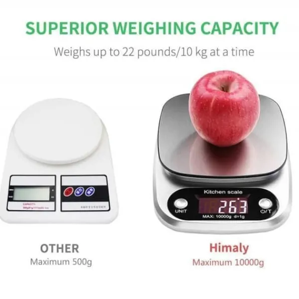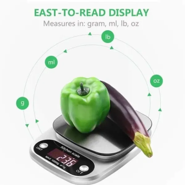 UTEN köksvåg är ett professionellt verktyg för konditorer och kockar. Den har en maximal kapacitet på 10 kg med en hög precision på 1 g. Den är utrustad med en stor LCD-skärm och tarafunktion. Den är gjord av rostfritt stål och plast och fungerar med 3 AAA-batterier. Den mäter 212x155x30mm och väger 220g. Den kan mäta i g, oz, ml och fl.oz.