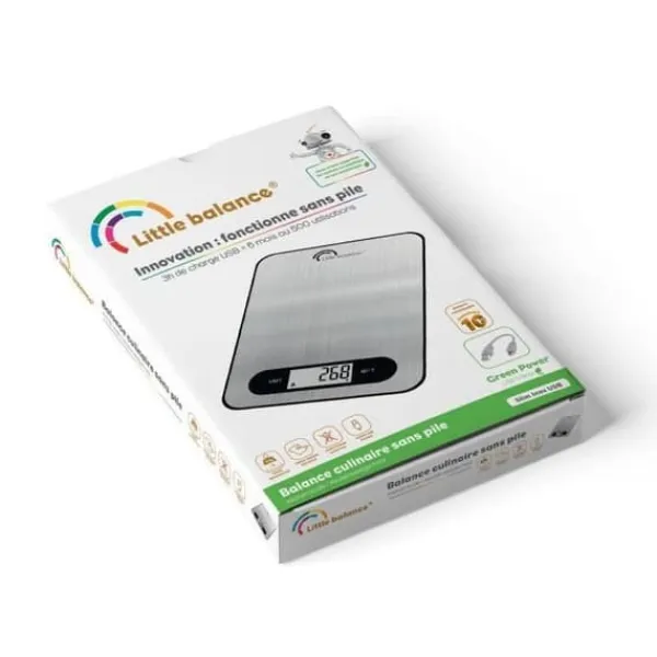 Den slimmade kulinariska vågen i rostfritt stål är en innovation från Little Balance. Den fungerar utan batterier och kan laddas via USB. Dessutom kan den repareras av användaren. Med bara 3 timmars USB-laddning kan den användas i 6 månader eller 500 användningar.