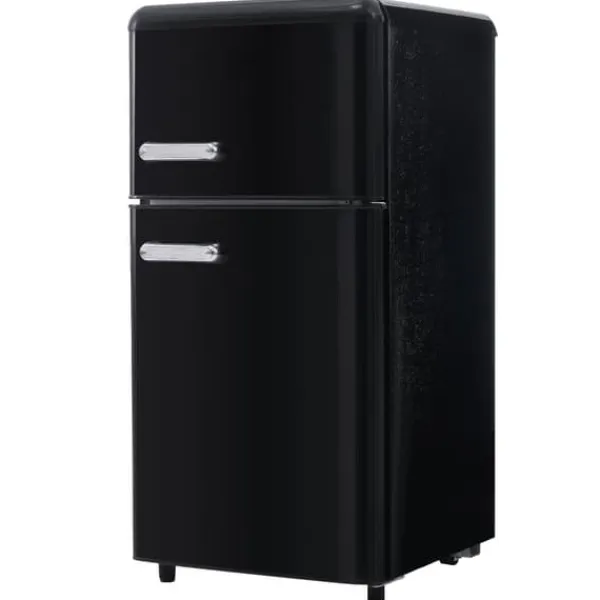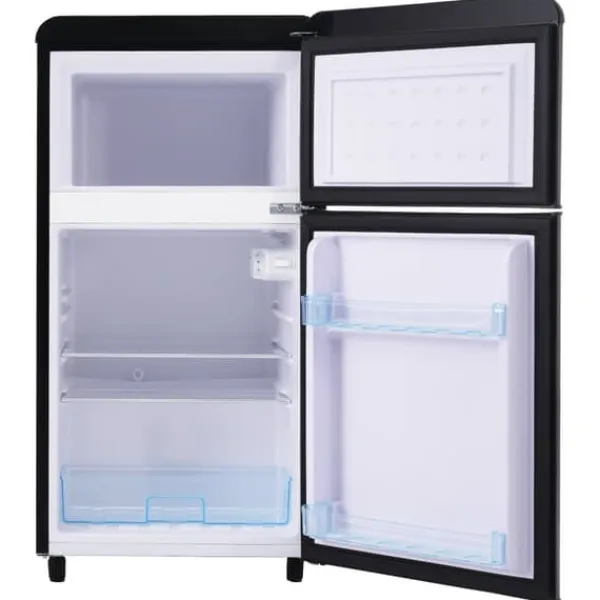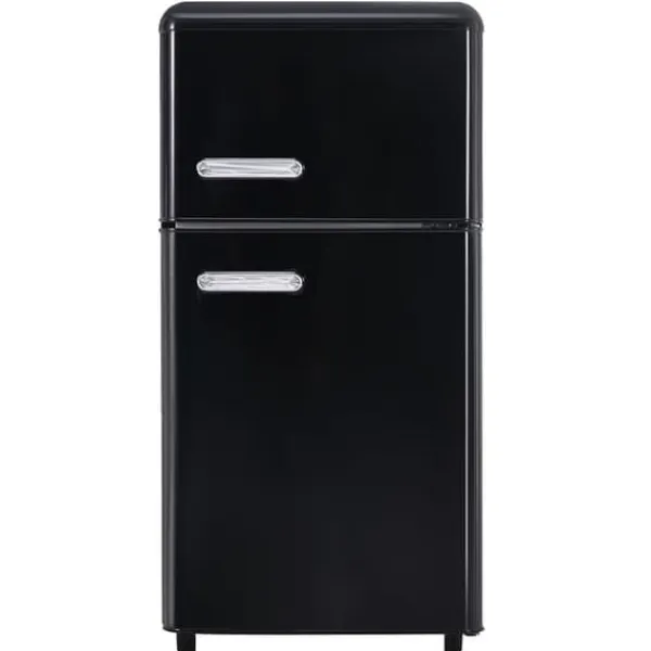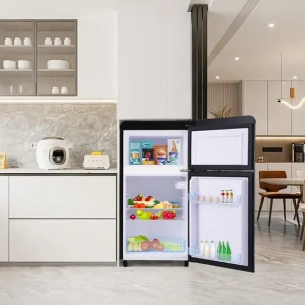 Denna retro kylskåp med dubbel dörr är både stilfull och funktionell. Med ett totalt utrymme på 72 liter, inklusive 21 liter frysfack och 51 liter kylfack, är det perfekt för mindre hushåll eller extra förvaring. Dess kompakta design och justerbara hyllor gör det enkelt att organisera dina livsmedel.