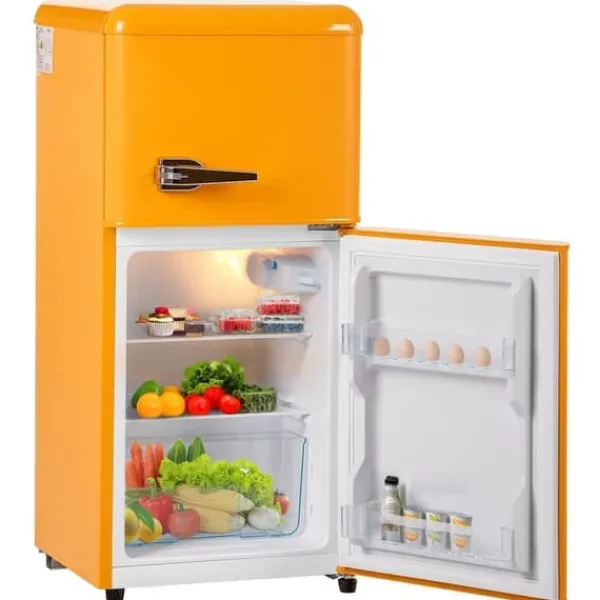 Dieser Retro-Doppeltür-Kühlschrank in Premium-Gelb bietet mit einer Gesamtvolumen von 60 Litern die perfekte Kombination aus stilvollem Design und hoher Energieeffizienz. Mit einem 22L Gefrierfach und einem 38L Kühlfach ist er ideal für begrenzte Räume und als Backup-Kühlschrank geeignet. Die sieben Temperatureinstellungen und LED-Beleuchtung machen ihn zu einem praktischen und dekorativen Haushaltsgerät.