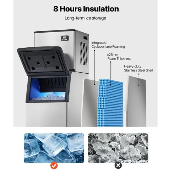 Stark isolering: Med ett isolerande bomullshölje och galvaniserat plåthölje kan ismaskinen hålla isbitarna kalla i upp till 6-8 timmar.