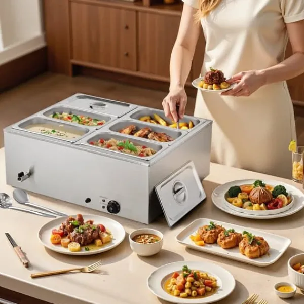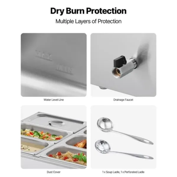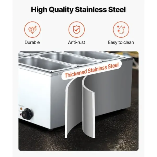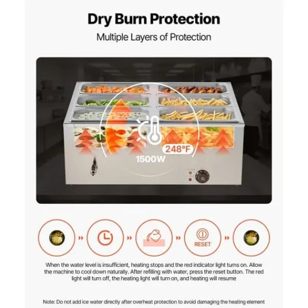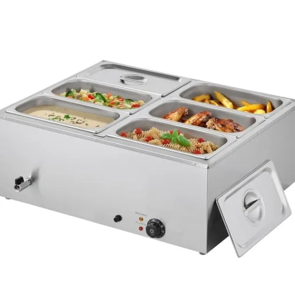Denna kommersiella matvärmare är utrustad med ett kraftfullt värmerör i rostfritt stål med en effekt på 1500 W. Den ger en snabb och jämn uppvärmning för att behålla matens smaker fräscha. Med en justerbar temperatur från 30–85 °C kan du anpassa den för olika rätter och serveringsbehov.