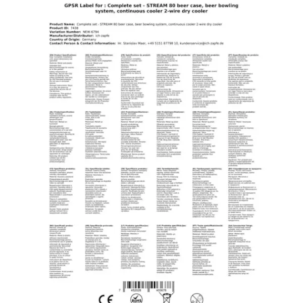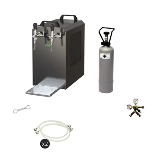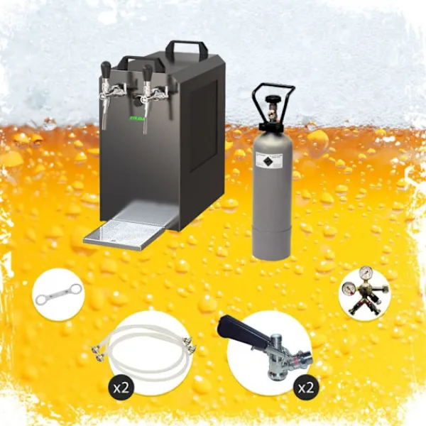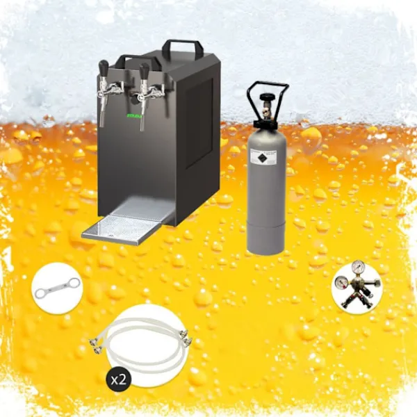 Komplett uppsättning Öltapp, Ölautomat, Ölmaskin – STREAM 80 öllåda, flödeskylare 2-linje torrkylareBestår av:•STREAM 80 ölkassett, flödeskylare 2-linjers torrkylare•anslutningar john gäst•1 x tryckreducerare 2 rader CO2 för öl Öltapp 3 bar•1 x CO2 – flaska 2,0 kg•2 x CO2 slang komplett, 1,5 m•2 x öl slang John Guest – 3/8 och 5/8 skruv-på kontaktdonet 2,00 m – helt klar•kolsyra key fångenskapÖltapp – STREAM 80 ölväska, genomströmningskylare, 2-linje torrkylare 3 minuter att packa upp… 2 minuter att ställa upp… 1 minut att ansluta = oändligt njutande.En kall, klar, nyligen tappad öl – du har förtjänat det!Ölkylaren STREAM 80 2lt är avsedd för professionell kylning och serveringav utmärkt kyld öl i hemmiljö, på trädgårdsfesteroch för medelstora kommersiella användningar.•Reglerområde+2 till +10 grader•Prestanda:90 liter/h vid 10°C TD•Kylteknologiär 45% mer effektiv•Klar att användapå endast 5-10 minuterNär termostaten ställs på Max,kommer termoblocket (efter ca 10 minuter) att ackumulera en hög mängdenergi, vilket möjliggör serveringav flera kylda öl i följd.Kylteknologin för STREAM 80 Öltapp är cirka 45% mer effektiv än den elektriska energiförbrukningen.Ölet kyls ner till kranen.Kylöglorna är tillverkade av rostfritt stål och är därför stabila och hållbara.De använda materialen uppfyller de högsta hygienstandarderna och möjliggör en lång livslängd för kylaren. STREAM 80 2lt – och den kalla ölen strömmar från 2 kranarMed sin starka kylprestanda och perfekta dimensioner tillhör ölkylaren STREAM 80 de ledande 2-linjiga bords-/underbordskylarna på marknaden.Kylprestanda från 170 till 180 glas (0,5 liter) utmärkt kyld öl per timme,Den kraftfulla kompressorn STREAM 80 säkerställer en minimal energiförbrukning och en utmärkt kyld öl utan att skummaGenomströmningskylare STREAM 80 2ltg. – Effektivitet, Prestanda, NjutningTermoblocket för ölkylaren STREAM 80 har hög energikapacitet, vilket gör att en perfekt kyld öl kan serveras redan efter 5-10 minuter.När termostaten ställs på Max, kommer termoblocket (efter ca 10 minuter) att ackumulera en hög mängd energi, vilket möjliggör servering av flera kylda öl i följd.Kylteknologin för STREAM 80 Öltapp är cirka 45% mer effektiv än den elektriska energiförbrukningen.Ölet kyls ner till kranen.Kylöglorna är tillverkade av rostfritt stål och är därför stabila och hållbara.De använda materialen uppfyller de högsta hygienstandarderna och möjliggör en lång livslängd för kylaren.Genomströmningskylare STREAM 80 – Tekniska SpecifikationerDen eleganta STREAM 80 Torrkylaren med en vikt på endast 45 kg är utrustad med en 7 mm ledning.•Mått:(BxDxH) 255х635х510 mm (inklusive droppbricka)•Strömspänning:220V, 50 Hz, 764W, 4,3A•Kompressor:3/8 PS•Linjer:2 x ölsorter•Hölje:Metall, pulverlackerad, rostsäkerHög kvalitet på utförandet och förpackningen STREAM 80 – Bäst i klassen för 2-linjiga zapfanläggningarÖlkylaren STREAM 80 är i kategorin Öltapp upp till 90 l/h, en av de bästa när det gäller förhållandet mellan kostnad,prestanda och kvalitet.Enkel rengöring av STREAM 80Med följande rengöringsset kan du enkelt och bekvämt rengöra ölkylaren STREAM 80 efter användning:Rengöringsset litetLättrengöringsset(rekommenderas)Städningsset stortÖltapp STREAM 80 – Bierkoffer, Genomströmningskylare med 2 linjer, Torrkylare, upp till 60 liter/hDet är bara att tappa några öl:Packa upp zapfanläggningenAnslut tryckregulatorn till CO2-flaskan med kolsyre-nyckeln och dra åtAnslut CO2-slangen från tryckregulatorn till tapphuvudetAnslut ölslangen till tapphuvudet och sätt in och fixera i zapfanläggningenTappa fatetJustera tapptrycket på tryckregulatornAnslut zapfanläggningen till eluttagetJustera trycket och njut av en kall öl