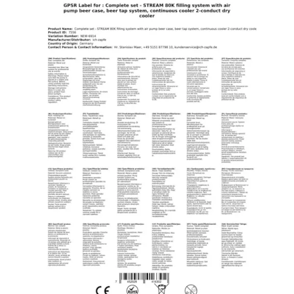Komplett set – Öltapp STREAM 80K med luftpump, ölväska, genomströmningskylare, 2-linjers torrkylare Består av: •STREAM 80K med luftpump, ölväska, genomströmningskylare, 2-linjers torrkylare•2x tryckluftsslang komplett John Guest 5/16 till 3/4 skruva på för att skruva på dispenseringshuvudena•2x ölslang komplett John Guest 3/8 till 5/8 skruva på för att skruva på kranhuvudena•2x kranhuvuden efter eget val (utan kranhuvuden, 5 liters adapter, platt, kombi, Köpi, triangulär, korg)•Anslutningar: John Guest Öltapp STREAM 80K med luftpump, ölväska, genomströmningskylare, 2-linjers torrkylare Öltapp STREAM 80K med luftpump, ölväska, genomströmningskylare, 2-linjers torrkylare 3 minuter att packa upp… 2 minuter att montera… 1 minut att ansluta = oändlig njutning.En kall, klar, nyutkastad – du förtjänar det!Ölkylaren STREAM 80K 2lt är avsedd för professionell kylning och utskänkningav utmärkt kyld öl i hemmamiljö, på trädgårdsfesteroch för medelstora kommersiella användningsområden. •Reglerområde+2 till +10 grader•Effekt:90 liter/timme vid 10°C TD•Kylteknologiär 45% mer effektiv•Klar att användapå bara 5-10 minuter När termostaten är inställd på Max,kommer termoblocket (efter ca 10 minuter) att ackumulera en hög mängdenergi och möjliggöra därmed en utskänkning avflera kylda öl i följd.Kylteknologin i STREAM 80K Öltapp är cirka 45% mer effektiv än den elektriska effektförbrukningen.Ölet kyls ned till tappkranen.Kylöglorna är tillverkade av rostfritt stål och är därför stabila och hållbara. De använda materialen uppfyller de högsta hygienstandarderna och möjliggör lång livslängd för kylaren. STREAM 80K 2lt – och den kalla ölen strömmar från 2 kranar Med sin starka kyleffekt och perfekta dimensioner är Öltapp STREAM 80K en av de ledande 2-linjers bord-/underbänkskylarna på marknaden. Kyleffekt på 170 till 180 glas (0,5 liter) utmärkt kylt öl per timme, Den kraftfulla kompressorn STREAM 80K säkerställer minimal energiförbrukning och utmärkt kylt öl utan skumning Genomlopps-/torrkylare STREAM 80K 2ltg. – Effektivitet, Effekt, Njutning Termoblocket i STREAM 80K ölzapfanläggning har hög energikapacitet, vilket gör att perfekt kyld öl kan tappas redan efter 5-10 minuter. När termostaten är inställd på Max, kommer termoblocket (efter ca 10 minuter) att ackumulera en hög mängd energi och möjliggöra därmed en utskänkning av flera kylda öl i följd. Kylteknologin i STREAM 80K Öltapp är cirka 45% mer effektiv än den elektriska effektförbrukningen. Ölet kyls ned till tappkranen. Kylöglorna är tillverkade av rostfritt stål och är därför stabila och hållbara. De använda materialen uppfyller de högsta hygienstandarderna och möjliggör lång livslängd för kylaren. Genomlopps-/torrkylare STREAM 80K – Tekniska Data Den ädla STREAM 80K Torrkylaren med en vikt på endast 45 kg är utrustad med ett 7 mm rör. •Mått: (BxDxH) 255x635x510 mm (inkl. droppskål)•Strömförsörjning: 220V, 50 Hz, 804W, 4,5A•Kompressor: 3/8 PS•Rörledning: 2 sorters öl•Hölje: Metall, pulverlackerad, rostskydd Hög kvalitet på utförande och förpackning STREAM 80K – Bäst i klassen för 2-linjers Öltapp Ölkylaren STREAM 80K är i kategorin Öltapp upp till 90 liter/timme, en av de bästa när det gäller kostnads-, prestanda- och kvalitetsförhållandet. Enkel rengöring av STREAM 80K Med följande rengöringsset kan du enkelt och bekvämt rengöra din STREAM 80K Öltapp efter användning: Rengöringsset litet Lättrengöringsset (rekommenderas) Städningsset stort Öltapp STREAM 80K – 2 linjer, upp till 90 liter/timme Med bara några enkla steg kan du tappa: Packa upp Öltapp Anslut tryckregulatorn till CO2-flaskan med koldioxidnyckeln och dra åt Anslut CO2-slangen från tryckregulatorn till tapphuvudet Anslut ölslangen till tapphuvudet, sätt in den i zapfanläggningen och fixera den Anslut öltunnan Ställ in trycket på tryckregulatorn Anslut zapfanläggningen till eluttaget Ställ in trycket och njut av kall öl