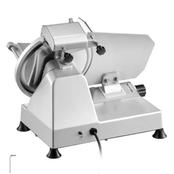 Denna kommersiella elektriska köttskärare är utformad för effektiv och exakt skivning av kött, grönsaker, bröd och ost, vilket gör den idealisk för både professionella kök och hemmabruk. Med en robust konstruktion och ett vasst, lättskött blad garanterar den smidig drift och jämna resultat. Den justerbara tjockleksinställningen gör att du kan anpassa skivorna efter olika maträtter.