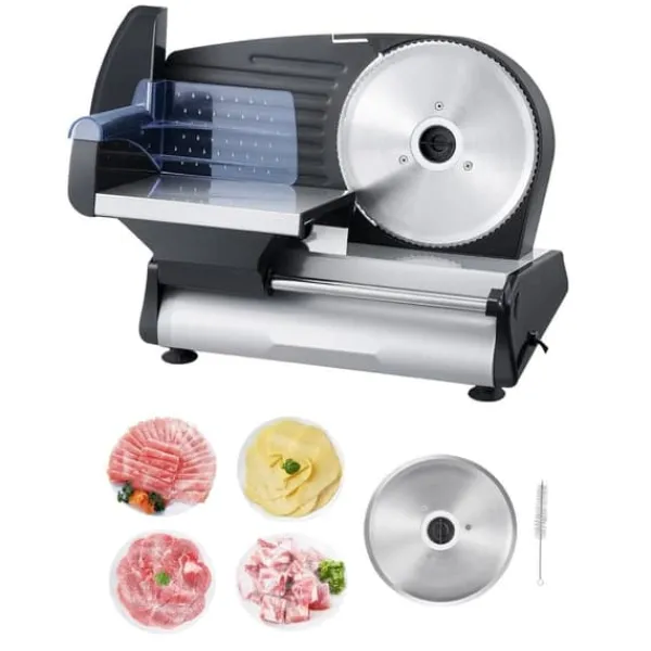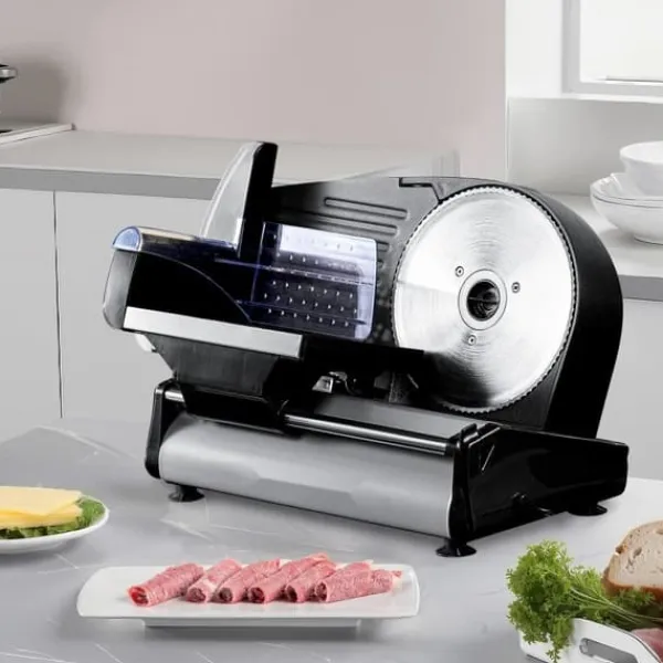 Denna köttskärare har ett uppgraderat 7,5″ brett blad i rostfritt stål som enkelt hanterar olika mattexturer som fryst kött, ost, skinka och bröd.