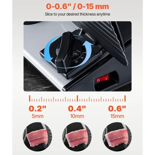 - Justerbar tjocklek: Deli-köttskäraren har en tjockleksjusteringsratt som ger dig möjlighet att styra tjockleken från 0-0,6 tum (0-15 mm) för att möta dina specifika behov.