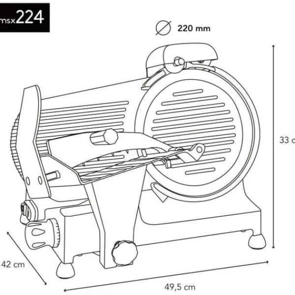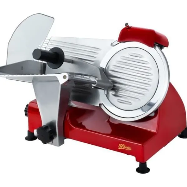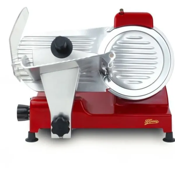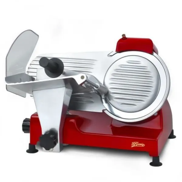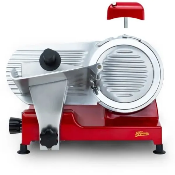 Köttskärare – H.KOENIG – MSX224 – 22 cm blad – Röd. Skär och skiv som en professionell. Utrustad med ett italienskt blad av hög kvalitet kan du skära alla dina livsmedel perfekt tack vare dess diameter på 220 mm. Justera skärningen (från 0 till 12 mm) för att anpassa köttskäraren efter dina behov: hantverksmässig skinka, carpaccio av nötkött, brödskivor, frukt, ost… Kraftfull, snabb och tyst tack vare sin asynkrona motor på 240 watt och 282 varv/min. Praktisk med sin integrerade bladslip för ett optimalt skärresultat och sin stora platta för att underlätta placeringen av en stor skinka. Dess 4 halkfria fötter eliminerar risken för att falla eller för instabilitet. Köttskäraren MSX220: för en exakt skärning!